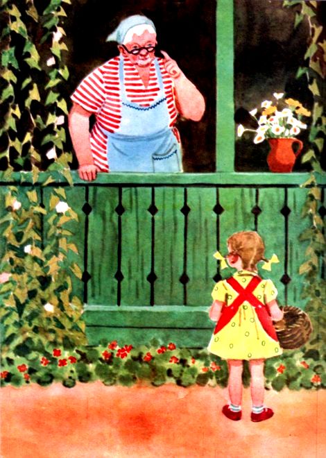 Утром бабушка умыла Машеньку, заплела ей косички, надела голубой передник и сказала: