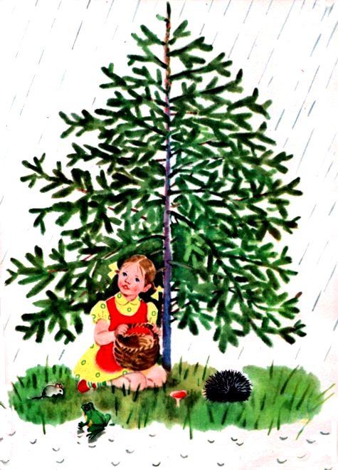 Вот сидят они рядышком в сыроежкином доме под ёлочкой, ни одна дождинка к ним не залетает. А вокруг уже настоящий ливень.
