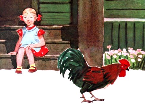 Машеньке очень хотелось поболтать рукой или. в крайнем случае, прутиком в этой луже, но она боялась соседского петуха. Он пролез через дыру в заборе к ним в сад и теперь расхаживал неподалёку.