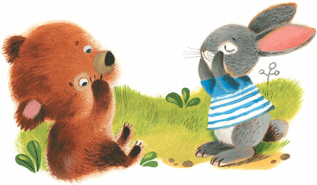 Вот сидят под большим кустом Медвежонок и Зайчонок и оба плачут. Листочками, как платочками, слёзы вытирают.