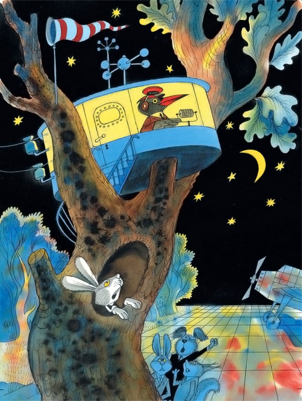 Крепко пристегнувшись ремнями, пассажиры послушно сидят на своих местах. Решив сажать самолёт, Трусохвостик поудобнее уселся в кресле пилота. Перед ним и вокруг него множество разных ручек, кнопок, выключателей, приборов, похожих на часы, и ещё много всякой всячины. Кошечка, устроившись рядом с Трусохвостиком, не сводит глаз с самого отчаянного храбреца на свете и точно передаёт ему все указания Главного Дятла, который командует по радио с Земли. Нельзя сказать, чтобы с самого начала всё шло как по маслу. Трусохвостик нажимал случайно не на ту кнопку, и самолёт почему-то начинал задирать кверху нос. Тогда Трусохвостик быстро хватался за какую-нибудь ручку, и самолёт тотчас переходил в другое, не менее опасное положение.