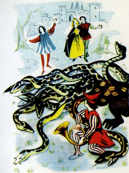 Спас всех музыкант. Он схватил охотничий рог и медленно заиграл колыбельную. Змея отступила назад, пламя утихло. Мелодия все продолжала звучать, она ширилась, росла, и головы гидры одна за другой стали выражать блаженство, потом радость и вскоре начали покачиваться в такт музыке. И на каждой голове левый глаз был зажмурен — явный признак того, что чудовище довольно.
