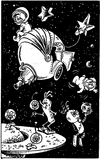 Это предложение всем пришлось по вкусу. Спустя несколько минут космонавты спокойно прогуливались по наружной части везделета и летали рядом с ним, точно сказочные птицы. Долго ли, коротко ли длилась их космическая прогулка, но только Непоседа вдруг закричал, что слышит музыку и голос радиодиктора. Друзья тотчас же подлетели к нему и стали прислушиваться.