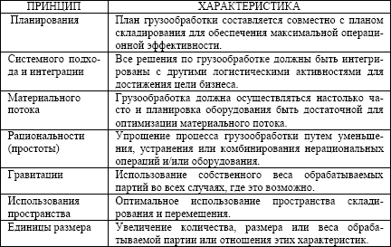 Основные логистические принципы современной грузообработки приведены в таблице. Они должны быть реализованы при управлении грузообработкой в логистических системах для повышения эффективности использования складской площади и высоты.