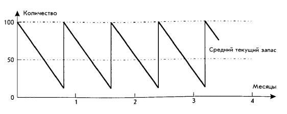 Рассмотрим движение запаса товаров в самом простом варианте. В течение месяца продается 100 каких-либо товаров. В конце месяца запас мгновенно пополняется, и цикл повторяется. В данном случае минимальный запас равен 0, максимальный – 100 шт., средний – 50 шт. Средний текущий запас является важным показателем для контроля запасов, он определяет среднюю величину средств, вложенных в запасы и среднюю стоимость их содержания.