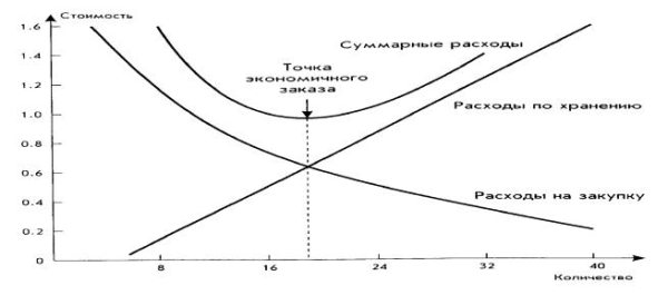 Оптимальные размеры заказов определяются при сопоставлении издержек на содержание запасов и расходов на заказы. Расходы на заказы – это издержки на закупку каждой партии, включающие затраты на контроль наличия, подготовку заказа, высылку заказа, получение товара, проверку количества и качества, раскладку по местам хранения, проверку документов, подготовку рекламаций, постановку на учет, бухгалтерские проводки. Затраты на заказы и на содержание запасов всегда анализируются, и для расчетов применяются средние величины. Очевидно, что чем чаще заказывать, тем дороже это обходится.