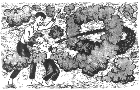 Ромка зажмурил глаза, я чиркнул коробкой по спичке, привязанной к дырочке в стволе. Спичка загорелась, в стволе что-то зашипело, повалил дым. Дым шёл, как из трубы самовара, когда его растапливают сырыми щепками.