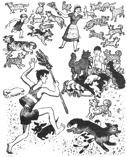 Мама прибежала, Женька… Схватили метлы, веники, палки, стали размахивать вениками… Гнать собак. Поднялась суматоха. А собаки никуда не хотели уходить, разбегались, опять сбегались. Мы вышвыривали их за ворота, в сад, выгоняли через калитку, обливали водой, кричали на них, грозились, — они всё равно через минуту возвращались назад неизвестно откуда, лезли из-под раскладушки, из чулана, из-под крыльца, даже одна в комнату забежала и спряталась под кровать. Никто не мог догадаться, откуда столько собак взялось. Еле-еле выпроводили эту ораву на улицу.