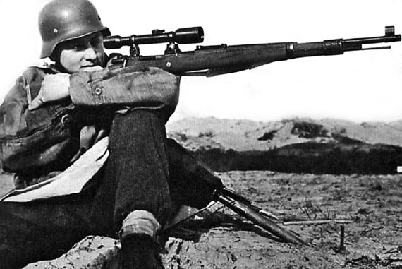 Немецкий снайпер стреляет из положения сидя. ВОВ