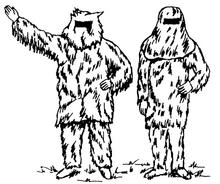 Искусные охотники научили сибирских стрелков незаметно передвигаться по открытому месту под «лохматым» камуфляжем. Очевидцы описывают такие тренировки снайперов под Ленинградом: инструктор, полностью накрытый «лохматым» камуфляжем, выжидал порывы ветра и при каждом колыхании травы чуть-чуть передвигал камуфляж над собой, в такт с движением растительности. Потом в такт с движениями травы он сам передвигался под неподвижным камуфляжем. Затем он снова перемещал над собой камуфляж и повторял цикл перемещений. Да, это было медленно – около 30–35 метров в час, но совершенно незаметно!