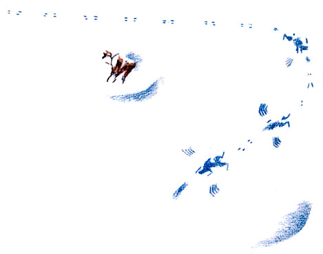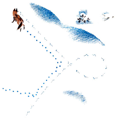А вот — лисий след, рядом с заячьим. Было так: ушёл заяц спать. Час проходит, другой. Идёт полем лиса.
