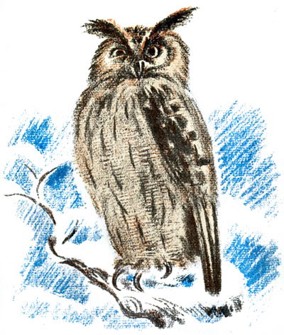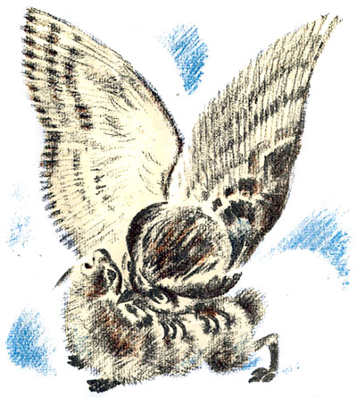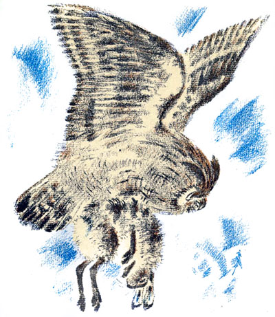 Ткнулся заяц в снег, а филин насел, крыльями по снегу бьёт, от земли отрывает.