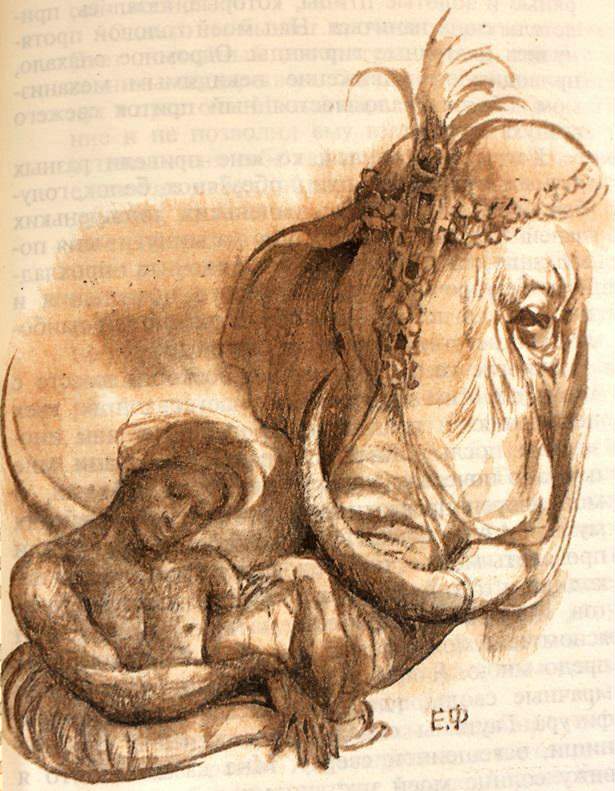 Однако шло время, и Аор состарился. Я видел, как седели его волосы и убывали его силы. Он объяснил мне, что наступила старость, и предупредил, что скоро умрет. Я старался продлить его жизнь, оберегая от всякого утомления. Когда он очень ослабел, я сам строил для него шалаш и приносил ему пищу. Кровь его стала холодеть, и он отогревался, прижимаясь ко мне. Однажды он, чувствуя приближение смерти, попросил меня вырыть для него яму. Я выполнил его просьбу. Он лег на дно ямы на подстилку из травы, обвил руками мой хобот и попрощался со мною. Затем его руки опустились, тело стало неподвижным и вскоре окоченело.