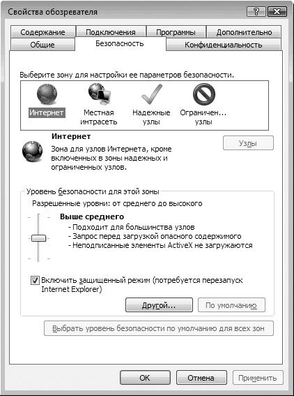 На вкладке Безопасность (рис. 7.36) есть возможность настройки уровня безопасности для каждой из зон, которых четыре – Интернет, Местная интрасеть, Надежные узлы и Ограниченные узлы.
