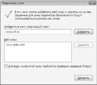 Можно также добавить в зоны Надежные узлы и Ограниченные узлы список подпадающих под эти условия узлов. Для этого необходимо выбрать нужную зону и нажать на кнопку Узлы. Откроется окно (рис. 7.37), в котором можно вводить адреса узлов, каждый раз нажимая кнопку Добавить. Для удаления узла выделите его и нажмите кнопку Удалить.