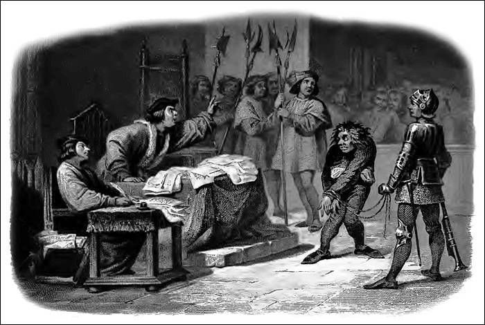 Этот выпад только увеличил приступ всеобщего веселья. Он показался всем до того неожиданным и до того несуразным, что бешеный хохот заразил даже сержантов городского совета общинных старост — эту породу копьеносцев, тупоумие которых было как бы необходимой принадлежностью их мундира. Один лишь Квазимодо, по той простой причине, что ничего не мог понять из всего происходившего, сохранял невозмутимую серьезность. Судья, раздражаясь все сильнее и сильнее, решил продолжать в том же тоне, надеясь нагнать страх на подсудимого