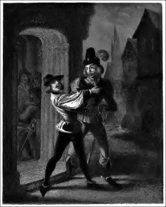 Читатель, наверное, уже узнал наших достойных приятелей, капитана и школяра. По-видимому, человек, стороживший их, хоронясь в тени, также узнал их, ибо он медленным шагом пошел за ними, повторяя все зигзаги, которые школяр заставлял описывать капитана, более закаленного в попойках и потому твердо державшегося на ногах. Внимательно прислушиваясь к их разговору, человек в плаще не пропустил ни слова из их интересной беседы.