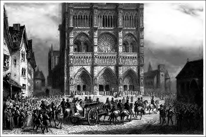 В эту минуту на часах Собора Богоматери медленно пробило двенадцать. Ропот удовлетворения пробежал в толпе. Едва затих последний удар, все головы задвигались, как волны от порыва ветра, на площади, в окнах, на крышах завопили — «Вот она!»