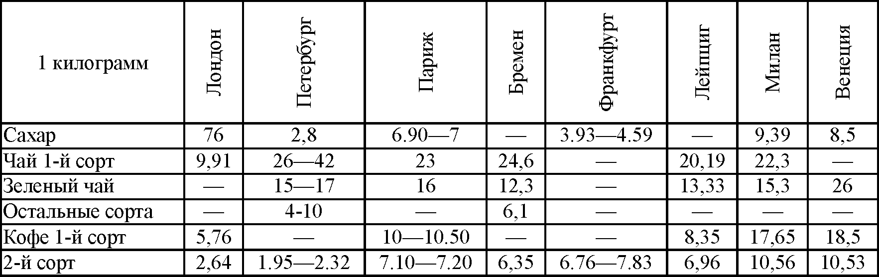 Дорожал хлопок, недоступными делались чай, кофе, сахар. Вот красноречивая таблица цен, которую императорское правительство предпочло не публиковать, хотя петербургский курс в апреле 1811 г. был 82 сантима за рубль, тогда как курс серебряного рубля был бы «около 3 франков 50 сантимов». Вот какие — по этому расчету во франках и сантимах — стояли цены на чай, сахар и кофе (как во всех подобных таблицах цен, и здесь находим обильные пропуски, показывающие, что правительство не успело разузнать соответственных данных) [101] .