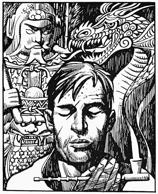И, когда взошла луна, люди, стоящие на страже, привели к императору чужестранца. Он был подобен им, только у него было шесть рук и румяное лицо 1 … Ни слова не произнес он, но — смеялся, и смех его отражал вечность. Войдя в шатер, он, еще не будучи приглашен, сел! Хоанг Ти угадал, что гость божествен. В надежде, что ему будет предложена помощь или союз с таинственными силами, он отослал своих слуг и остался наедине с гостем. Очень долго сидели они на двойном кресле из слоновой кости с инкрустациями из перламутра, созерцая друг друга.