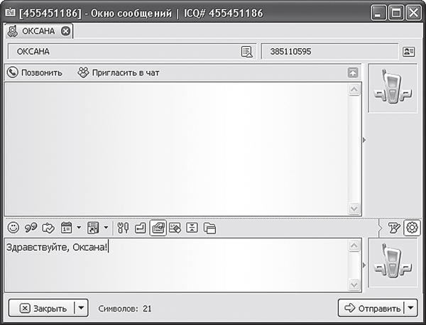 Для того чтобы отправить сообщение какому-либо пользователю, достаточно два раза щелкнуть кнопкой мыши на его имени, после чего появится окно диалога (рис. 3.28). В нижней части введем текст сообщения и нажмем кнопку Отправить.