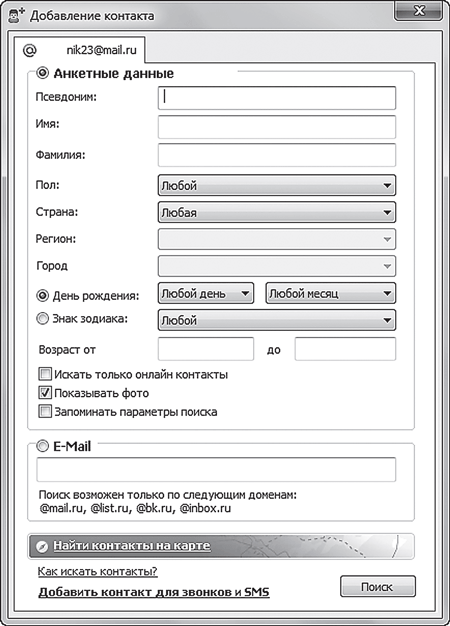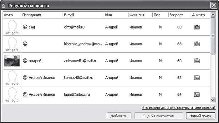 Добавление нового пользователя осуществляется через его предварительный поиск. В анкете либо вводим данные человека, которого нужно найти, либо устанавливаем указатель мыши в поле E-mail и вводим адрес его электронной почты. Затем нажимаем кнопку Поиск, и если такой контакт существует, то он отобразится в новом окне. Выделяем контакт из списка (щелкнуть на нем кнопкой мыши) и нажимаем кнопку Добавить (рис. 3.27).
