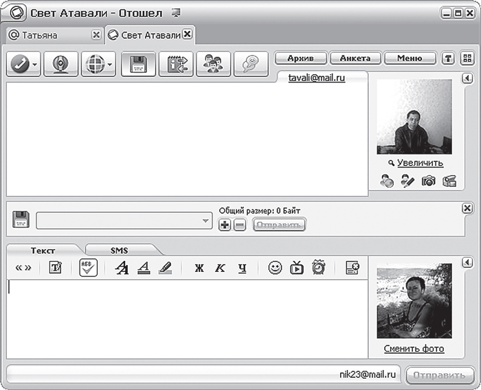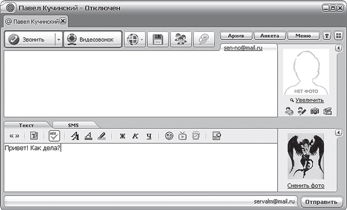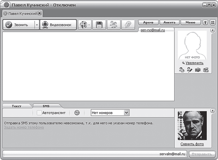 С помощью программы «Mail.ru Агент» можно совершенно бесплатно отправлять SMS-сообщения. Открываем окно диалога с другим пользователем и переходим на вкладку SMS (рис. 3.22).