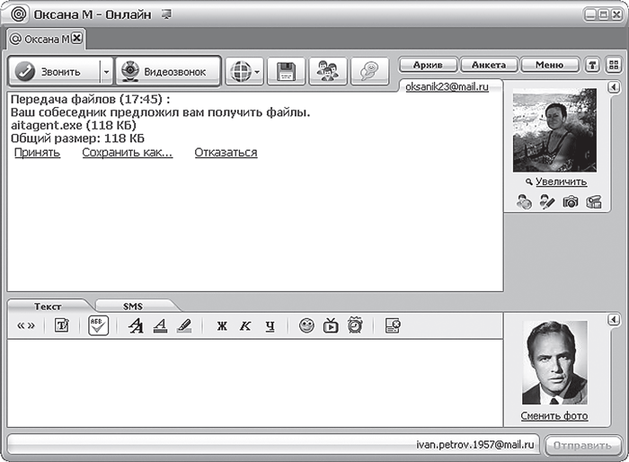 Одна из возможностей программы «Mail.ru Агент» — отправка и прием файлов. Эта функция пригодится вам и в дружеском, и профессиональном общении. Согласитесь, ведь очень удобно, рассказывая, например, о проведенном отпуске, отправить пару фотографий для наглядности. А порадовать друзей хорошей песней или электронной книгой? Как видите, данная возможность очень актуальна и востребована.