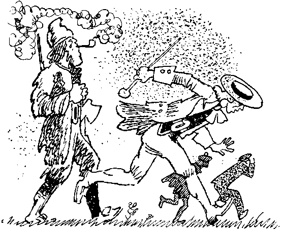 — Есть! Один экземпляр. Это я — барон Мюнхаузен. В битве с мошкарой я разорвал платье. Бил их ботфортами. Глушил париком. И всё напрасно. Меня спас только дым костра.