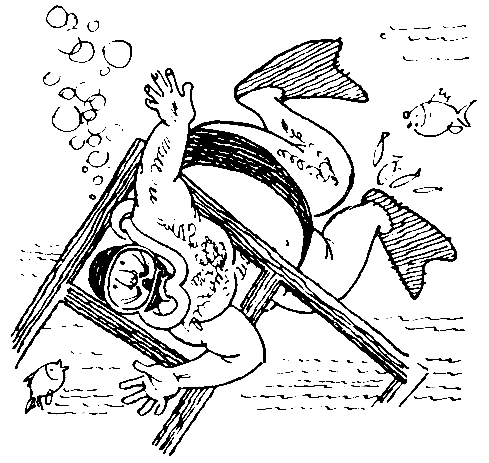 Включив электрический фонарь, первым проник в сарай Василий Фёдорович. Нетерпеливый Тартарен попытался его опередить. Он вплыл в разбитое окно сарая, но зацепился ранцем с кислородным прибором за раму и застрял. Увидев толстяка в столь затруднительном положении, Немо и Дик Сэнд поспешили на помощь и с трудом вытащили его за ноги.
