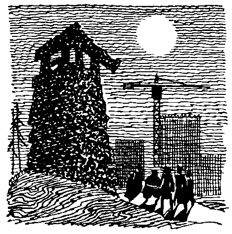 Вдруг их внимание привлекла какая-то старинная башня, сложенная из почерневших брёвен…