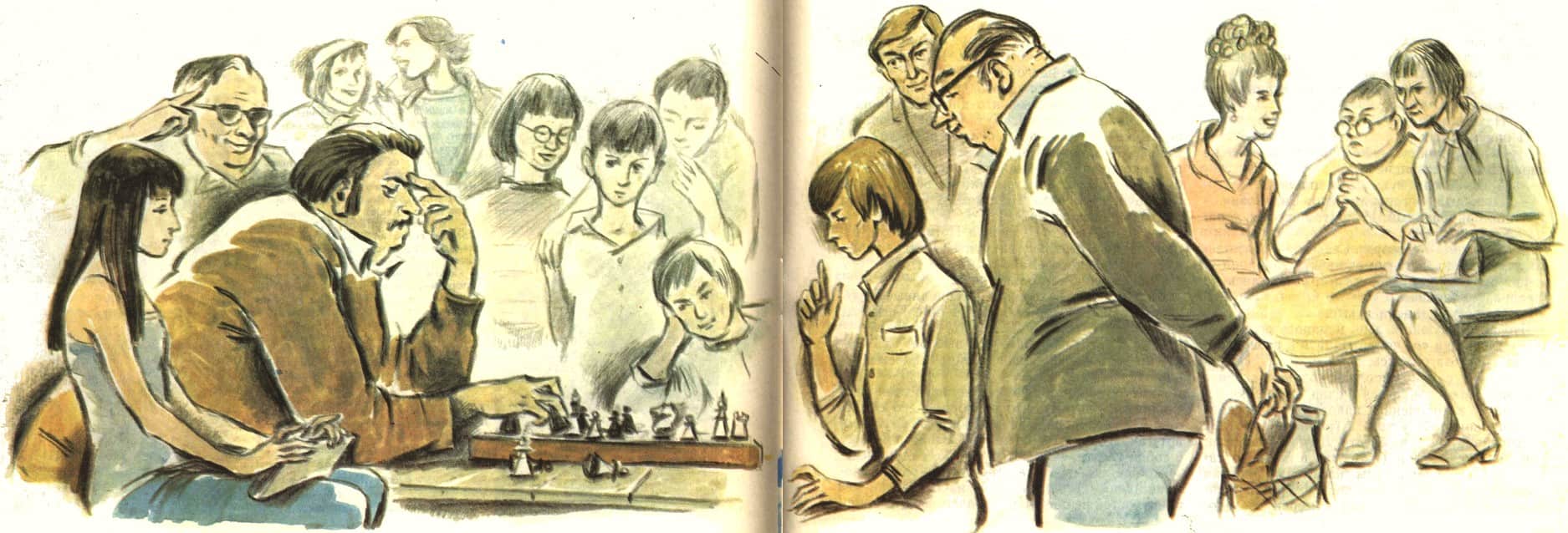 Сразу же вокруг скучивались шахматисты. Федор Тихонович одного за другим выставлял противников. Болельщики смеялись, подтрунивали над очередным неудачником. И только когда Сенька, девятиклассник из пятьдесят шестой квартиры, садился за доску, наступала тишина».