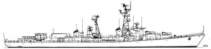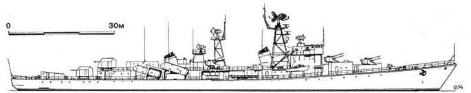 ПРОЕКТ 56-А [«Бравый»] Водоизмещение: полное 3620 134471, стандартное 3060 12890] т; длина 126,1 м, ширина 12,7 м, осадка 4,5 м. Мощность ПТУ 2x36 000 л.с.; скорость хода: максимальная 34,5 (35,51, экономическая 17 [18] уз; дальность плавания экономическим ходом 2150 J30001 миль. Вооружение: 1x2 ПУ ЗРК «Волна-М» (16 ракет), 1x2130-мм СМ-2-1 и 3x4 45-мм СМ- 20-ЗИФ орудия, 1x5 533-мм ТА, 2 РБУ-6000 (96 РГБ-60). Экипаж 268 [2701 человек, в том числе 19 офицеров.