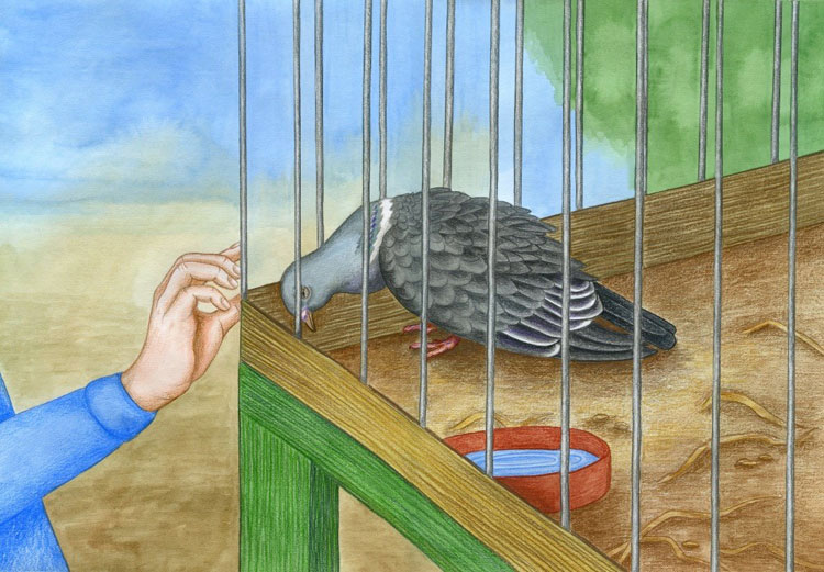 Побродив по рынку, Шура собралась было домой, но тут у самого выхода заметила продавца голубей с большой клеткой, полной птиц. В углу клетки неподвижно сидел грустный голубь. Его перья были тусклыми, и весь вид говорил о том, что он серьёзно болен.