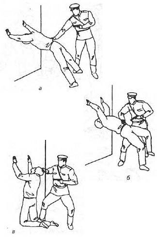 На рис. 66 «б» изображен более сложный вариант этого положения, когда пленный запрокинулся назад. Чтобы он не упал, можно подставить ему под спину свое колено, но заставить его при этом как можно больше запрокинуться назад.