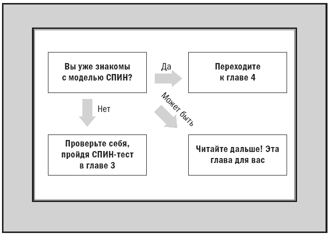 В этой главе мы вам расскажем, что же такое модель СПИН. Конечно, лучше ознакомиться с этой моделью можно, прочитав уже упомянутую выше книгу «СПИН-продажи». Если вы не знакомы с книгой «СПИН-продажи», сделайте это сейчас. Она очень легко читается, в ней есть ответы на многие вопросы, которые мы не можем разобрать здесь, и, кроме того, там приведена масса примеров и реальных случаев, показывающих, как работает модель СПИН на практике. К тому же если вы человек, стремящийся во всем дойти до самой сути, если вам нужны доказательства и истинный смысл, то все это вы найдете в «СПИН-про-дажах».