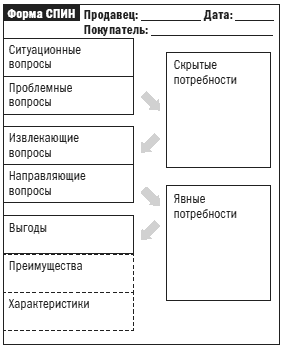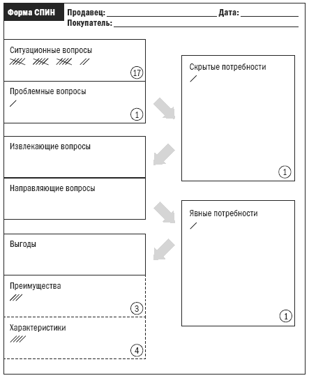 Наконец, я проигрывал пленку и одновременно использовал форму СПИН для анализа своих вопросов. Каждый раз, слыша в записи вопрос, я ставил галочку в соответствующей графе. Таким образом, я мог видеть, сколько вопросов было задано на встрече и как они распределяются по категориям вопросов СПИН. Так как я проделывал этот анализ часто, то научился слушать, не останавливая пленку, и при этом успевал разбирать, как менялись в процессе встречи типы поведения. Если вы прежде этим никогда не занимались, останавливайте пленку каждый раз, как обнаружите изменение типа поведения, и не двигайтесь дальше, пока не решите, вопрос какого типа задали и описали ли вы характеристику, преимущество или выгоду.