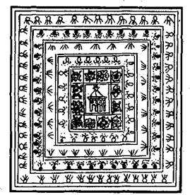 Рис. 38. План Просянскога сада-лабиринта (по А. П. Вергунову и ВЛ. Горохову), во внешних квадратах высаживали просо, овёс, рожь, пшеницу, ячмень, центральная площадь окантована 12 цветниками с индивидуальным орнаментом каждый