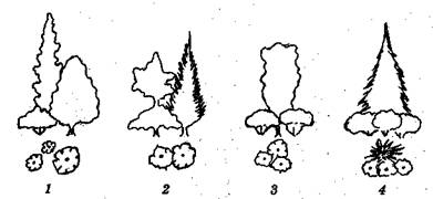Рис. 49. Контрасты в растительных группах: 1 – по форме кроны: купольная, колонновидная, зонтичная; 2 – поструктуре декоративной мозаики: широколистная катальпа бигнониевоя и лиственница европейская;3 – по высоте: верхний ярус– топольдушистый, нижний – шелковица белая; 4– по окраске листьев: сине-зелёная – пихта кавказская, серебристо-серая– лох узколистный