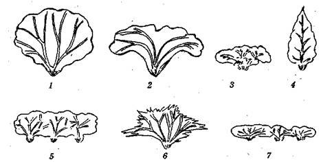 Рис. 53. Формы кроны кустарников: 1– шаровидная (жимолость; бересклет; калина); 2– сноповидная (спирея Ван Гута); 3 – подушковидная (кизильник скученный); 4– конусовидная (туя западная); 5– продольно-овальная (спирея); 6– раскидистая (можжевельник казацкий); 7– стелющаяся (кизильник горизонтальный и прижатый)
