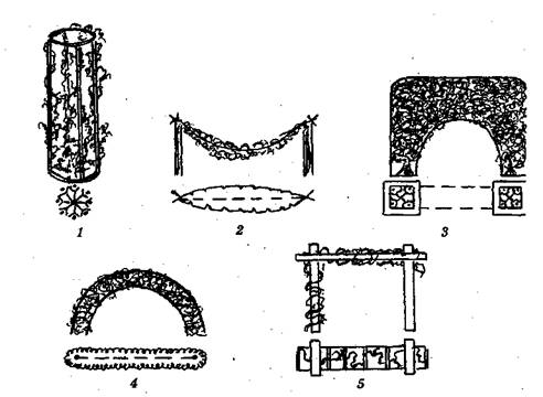 Рис. 59. Приёмы использования лиан в озеленении:1– «зелёная» колонна на каркасе; 2– гирлянда на канате; 3– «зелёные» ворота на металлическом каркасе; 4– «зелёная» арка на металлической дуге; 5 – пергола, увитая лианами.