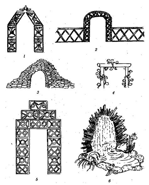 1 – кованая; 2– плетёная из лозы; 3– из природного камня; 4– из бруса, увитая лианами; 5– из керамических блоков; 6– арка-фонтан из сланцаместах