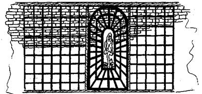 Рис. 78. Создание ложной перспективы. Решётчатая шпалера на кирпичной стене создаёт впечатление глубокой перспективы. Размещение в. центре зеркала, в котором отражается окружающий пейзаж, делает эту перспективу ещё более глубокой.