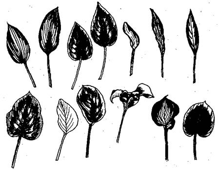 Однако чаще всего встречаются сочетания зелёных тонов с белыми и жёлтыми, которые называют variegate. Условно далее они будут обозначены как истинно пестролистные. Иногда к типичному сочетанию добавляются розовые или красные тона. Пестролистность проявляется в виде продольных или поперечных полос, пятен, мелкого крапа, каймы различной формы, иногда крупного центрального пятна (рис. 79).