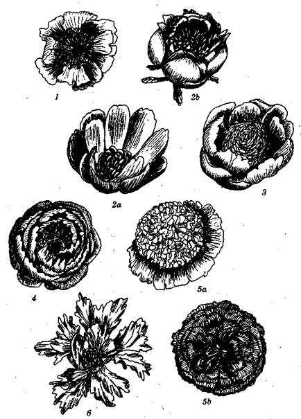 1– простая немахровая; 2– японская (а – тип Хайго,b – тип Эдо); 3– анемоновидная; 4– полумахровая, 5– махровая (а– розовидная, b– бомбовидная); 6 – кактусовидная