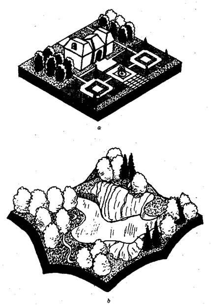 Puc. 111. Принципиальная структура а– регулярного («французского») иb – пейзажного ( «английского» ) стилей