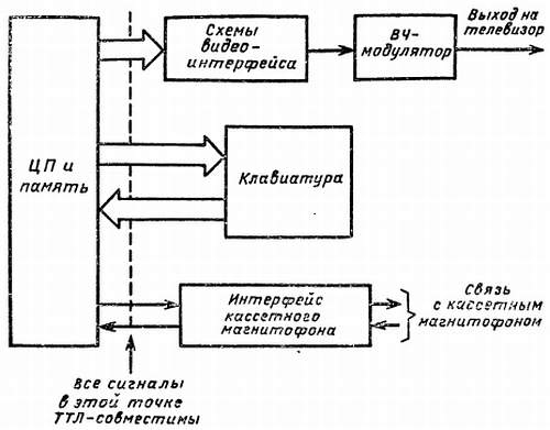 Микропроцессорная система без средств ввода и вывода оказывается бесполезной. Конечно, характеристики и объемы ввода и вывода в системе определяются, в первую очередь, спецификой ее применения. Например, в простом домашнем компьютере, как минимум, необходимы ввод с клавиатуры и вывод на обычный телевизор. Кроме того, желательны канал связи с бытовым магнитофоном и дополнительный выход на принтер (рис. 7.1).