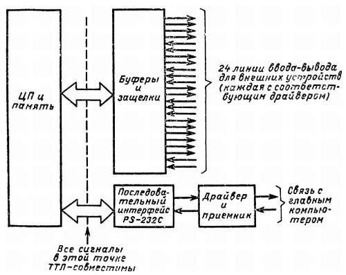 Однако, в микропроцессорной системе управления некоторым промышленным процессом не требуются клавиатура и дисплей, так как почти наверняка ее дистанционно программирует и контролирует главный микрокомпьютер (с использованием последовательной линии RS-232C). Контроллер должен иметь до 24 отдельных линий ввода и вывода для управления реле, двигателями и лампами (рис. 7.2).