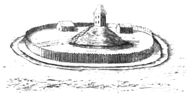 Опустошительные набеги неприятелей побуждали к построению таких укреплений, которые могли бы служить надежными убежищами. Первые замки представляли собою земляные окопы, более или менее обширных размеров, окруженные рвом и увенчанные деревянным палисадом. В таком виде они походили на римские лагеря, и это сходство, конечно, не было простой случайностью; несомненно, что эти укрепления устраивались по образцу римских лагерей. Как в центре римского лагеря возвышался преторий (praetorium) [1] , так посреди пространства, замыкавшегося замковым валом, поднималось естественное или по большей части искусственное земляное возвышение конической формы. Обыкновенно на этой насыпи воздвигалось деревянное строение, входная дверь которого находилась на самом верху. Таким образом, попасть в это строение можно было, только взобравшись на самую насыпь. Внутри насыпи был ход в подземелье с колодцем.