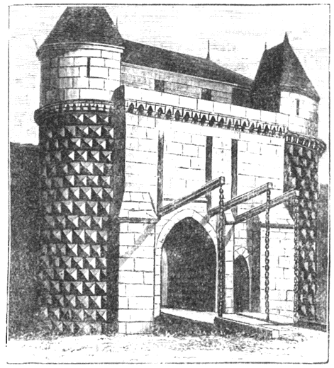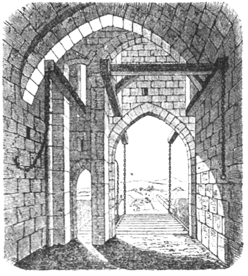 Подъемные мосты опускались и поднимались при посредстве цепей или канатов. Делалось это следующим образом. Над воротами, в стене, соединяющей обе недавно названные башни, были проделаны продолговатые отверстия; они направлялись сверху вниз. В каждое из них продевалось по одной балке. С внутренней стороны, то есть с замкового двора, эти балки соединялись поперечной перекладиной, и здесь же от конца одной из балок спускалась железная цепь. К противоположным концам балок, выходившим наружу, прикреплялись две цепи (по одной к каждой балке), а нижние концы этих цепей соединялись с углами моста. При таком устройстве стоит только, войдя в ворота, потянуть вниз спускающуюся там цепь, как наружные концы балок начнут подниматься и потянут за собой мост, который после поднятия превратится как бы в перегородку, заслоняющую ворота.
